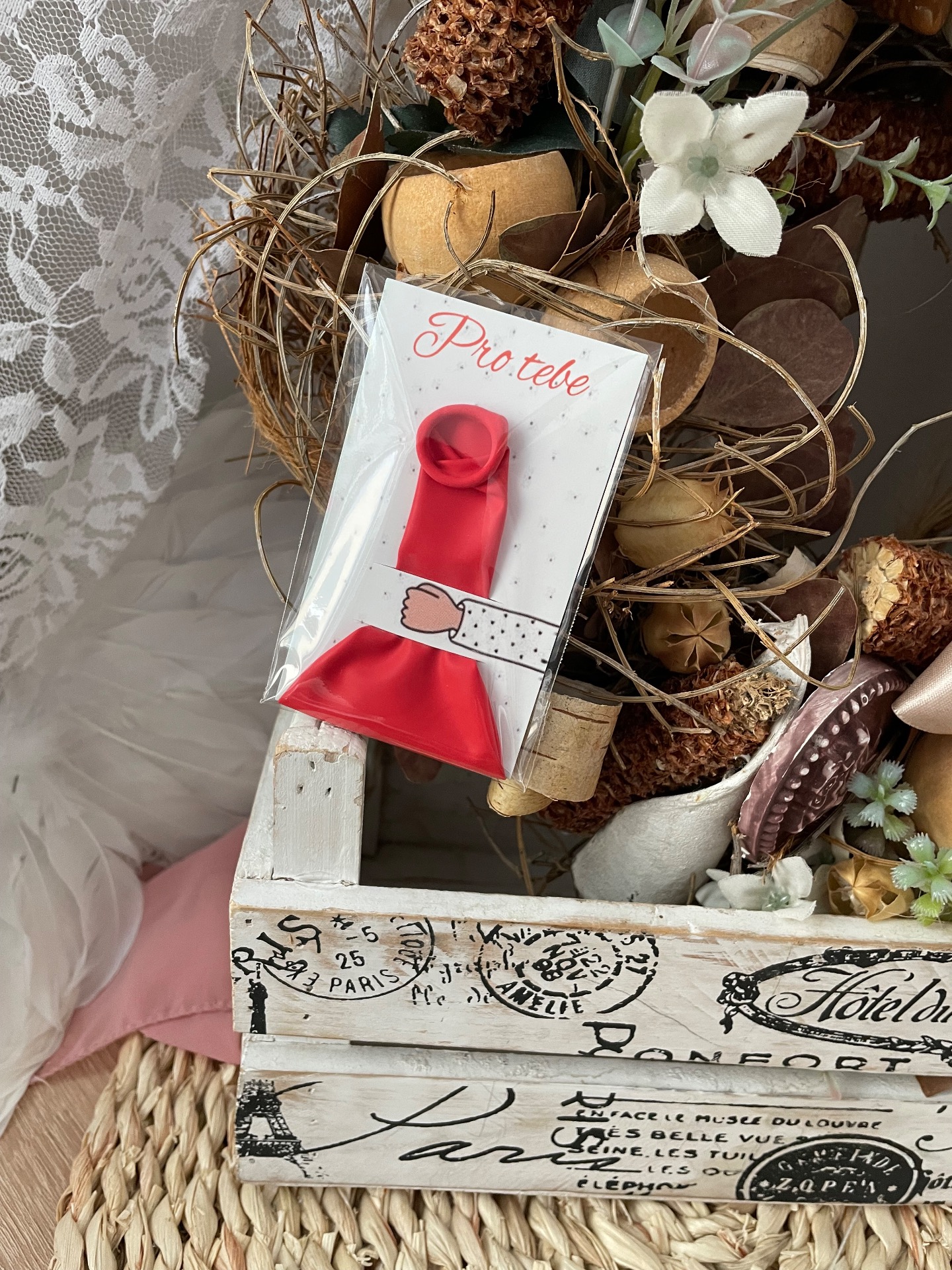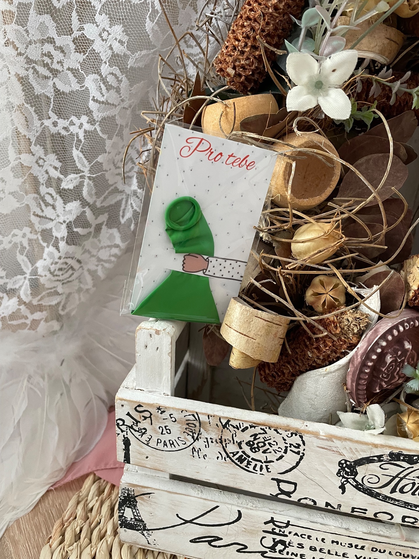 Klasický balonek na kartičce, balený v celofánovém sáčku.