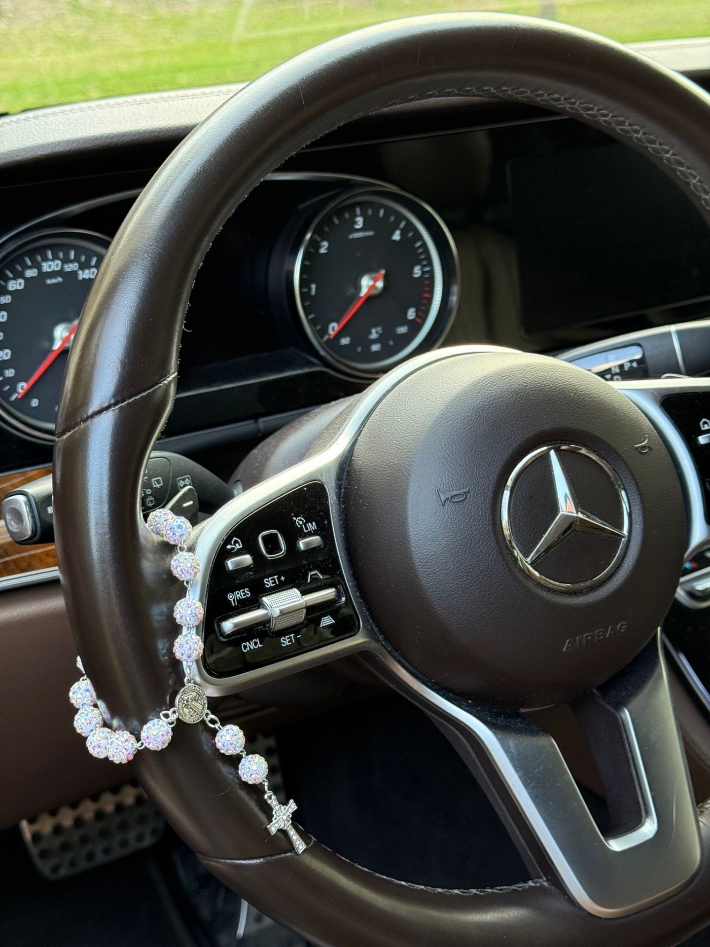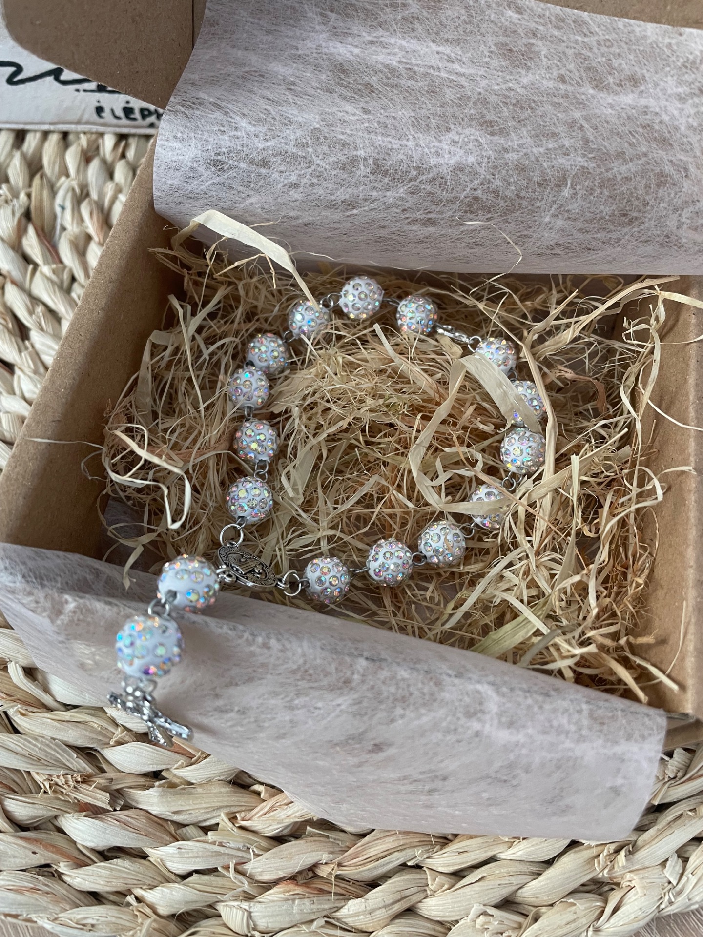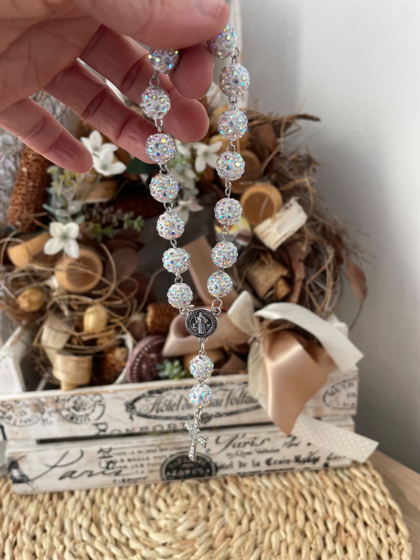 Růženec,dekorace do auta-bílý