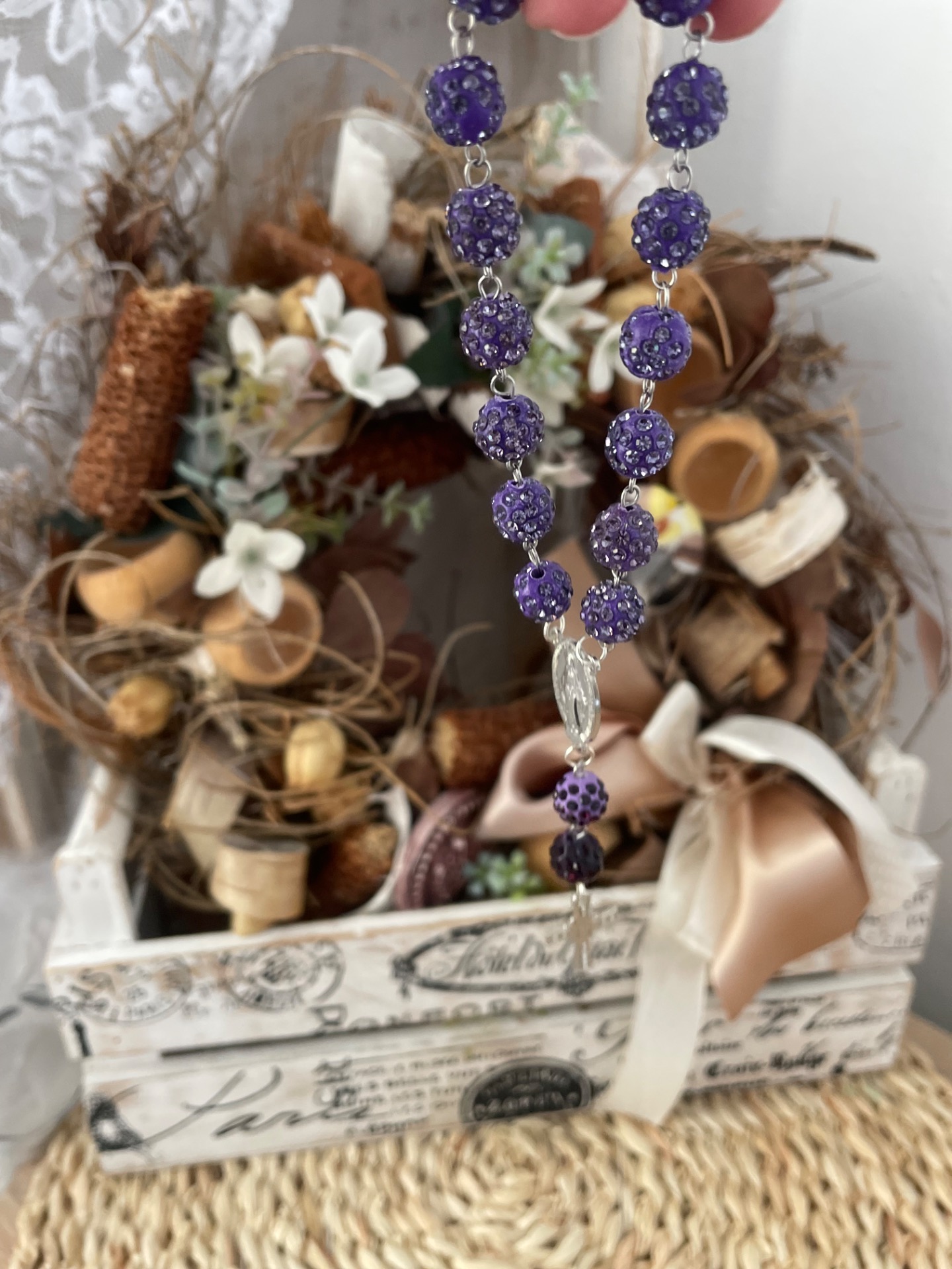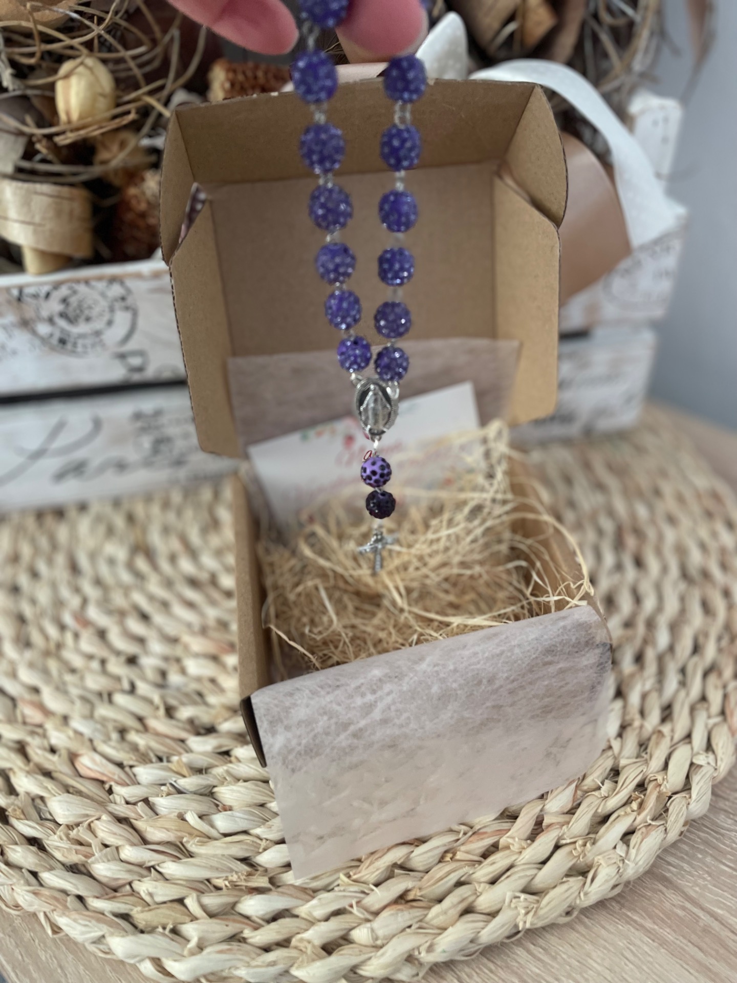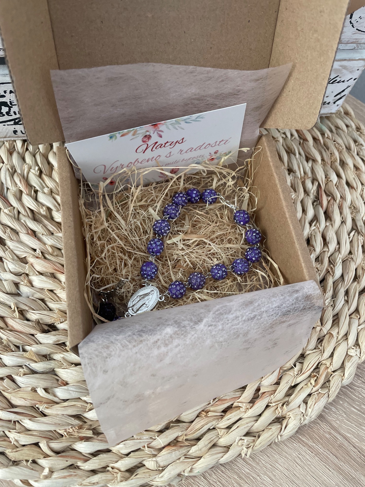 Růženec,dekorace do auta-fialkový
