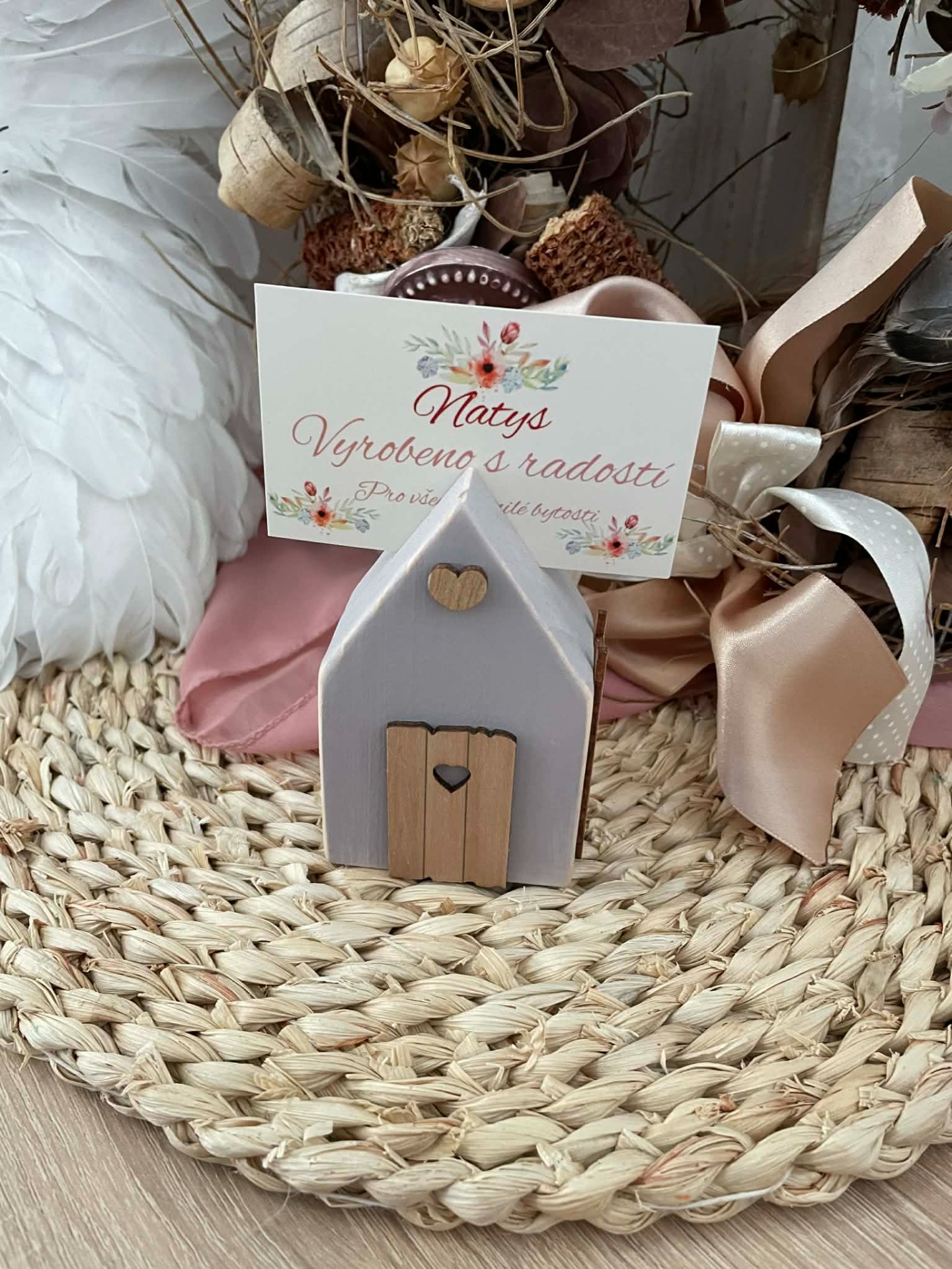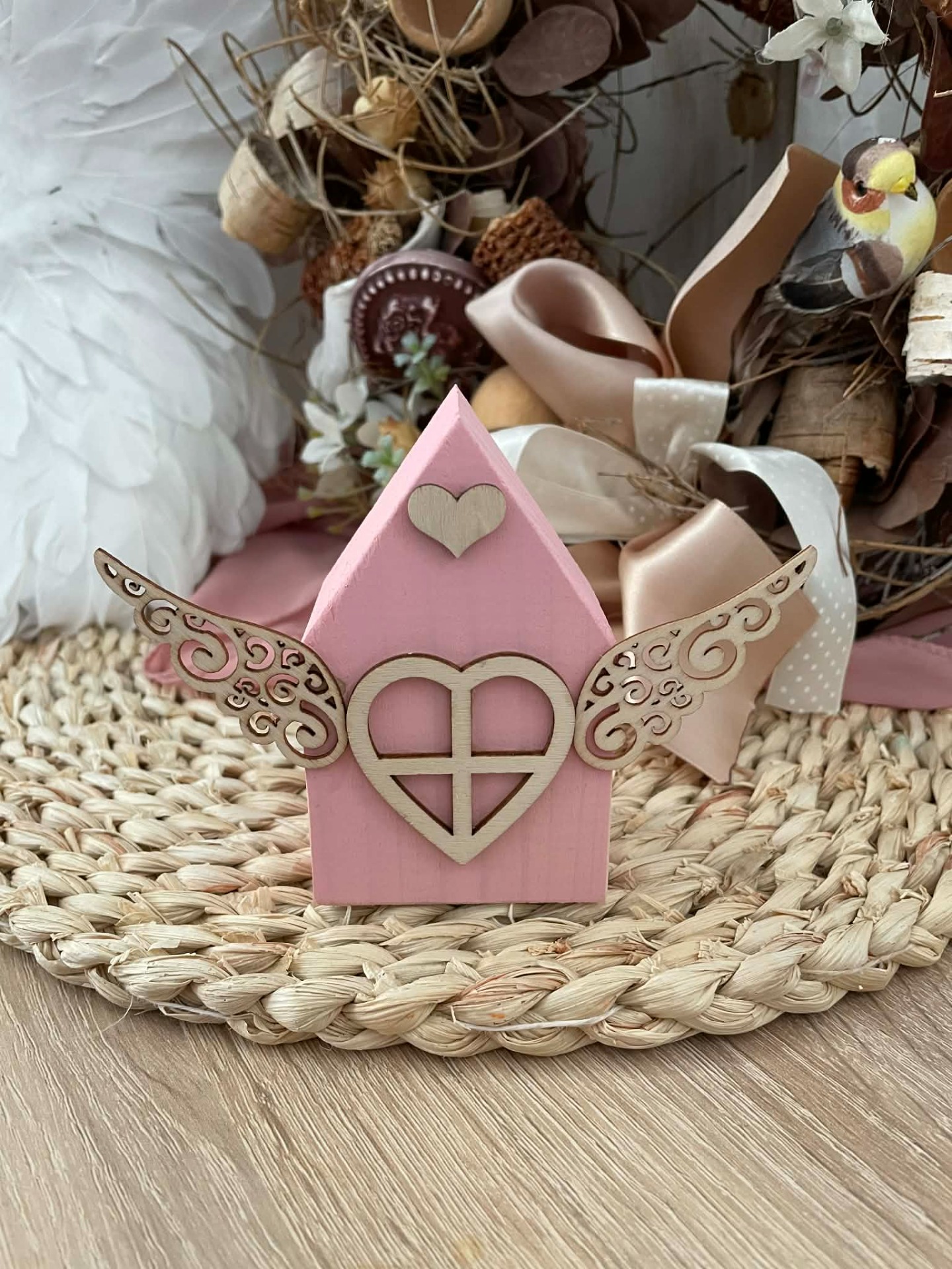 Dřevěný domeček růžový-anděl